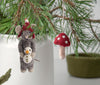 Mouse wears a festive red pointy hat and carries a tiny little felt snowman.